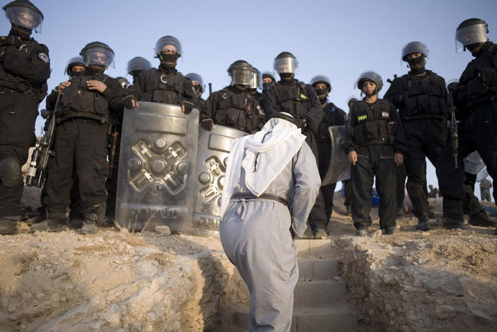 עוברות עוד מספר דקות. השמש עדיין לא התרוממה מעל לקו האופק, אך השמיים במזרח מאדימים והאור הולך ומתחזק. הנשים והילדים נמצאים בבתים, וחלק מהפעילים מצטרף אליהם. שאר הפעילים נשארים עם הגברים בחוץ. יש כבר אור כמעט מלא, ועל דרך הגישה לכפר אנו רואים שיירה ארוכה של כלי רכב נוהרים לכיווננו – כלי רכב של היס״מ, אוטובוסים המובילים שוטרים ואנשי יס״מ נוספים, משאיות להובלת ציוד, שופלים צהובים בעלי גלגלי ענק, רכב לפיזור הפגנות, וכלי רכב נוספים רבים. זה נראה יותר כמו יציאה לקרב מאשר התארגנות להריסה של כמה בתים. כוח משטרתי בכזה סדר גודל לא ראיתי מעודי. להגנת המשטרה מפני טענות על בזבוז כספי הציבור, יש להיות הגונים ולומר, כי עד כה, מעולם גם לא פונה ונהרס כפר שלם בגודל של אל־עראקיב. כלי הרכב מגיעים לכפר, וחונים לא הרחק מאיתנו, בסדר מופתי. לפחות על זה לא יצטרכו ועדת חקירה. שוטרי היס״מ נערכים בקבוצות במספר מקומות בכפר, ועדיין לא מתקדמים לכיווננו. גם מרחוק הם די מפחידים – לבושים בסרבלים שחורים, חלקם אוחזים במגנים, ורובנו כבר מכירים אותם ממפגשים קודמים.