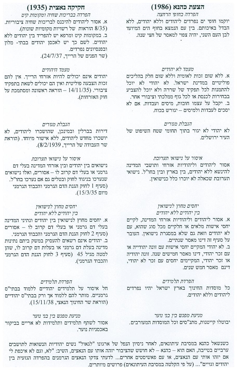 אני הלכתי צעד נוסף באותו הכיוון: מצורפת כאן טבלה המצביעה בברור על הזהות שבין הצעת החוק שהכין כהנא בזמנו נגד הערבים לחוקי נירנברג הנאציים נגד היהודים. הטבלה פורסמה בגיליון הראשון של "אנטיפא – עיתון אנטי פאשיסטי ישראלי" שראה אור באפריל 1986 בהוצאת "האיגוד הישראלי של לוחמים אנטי-פאשיסטיים וקורבנות הנאציזם". להלן הטבלה: