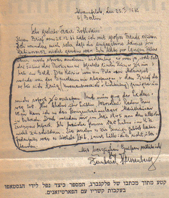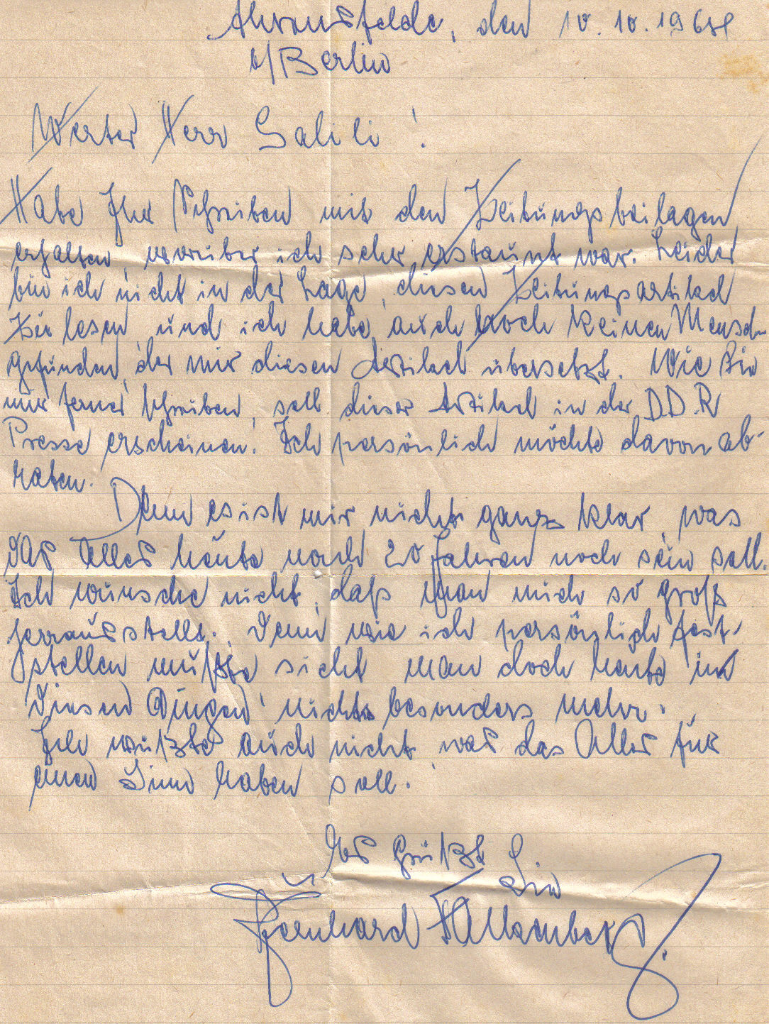 קיבלתי את מכתבך יחד עם קטעי העיתונות ועל כך התפלאתי מאוד. לצערי אינני מסוגל לקרוא את המאמר ועדיין לא מצאתי מישהו שיכול לתרגם אותו עבורי. כפי שאתה בנוסף כותב אמור המאמר להתפרסם בעיתונות המזרח גרמנית. אני באופן אישי ממליץ להימנע מכך.